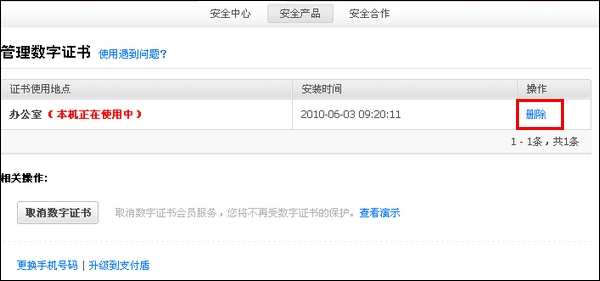 如何删除本地证书? 大文 五月 26, 2016 安全中心 0 条评论 1330 围观 1 登录支付宝账户( www.alipay.com), 点击【安全中心】—【安全管家】—数字证书【管理】 2 点击【删除】, 删除本地证书后,账户将不能进行资金操作。如果您不想使用数字证书,请您选择【取消数字证书】,点击【删除】,并在弹出的页面请选择【是】 3 删除成功