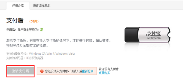 如何激活支付盾? 大文 五月 26, 2016 安全中心 0 条评论 1687 围观 1 登录支付宝账户( www.alipay.com), 插上支付盾, 点击【安全中心】—【安全管家】—【支付盾】,点击【申请】 2 点击【激活支付盾】 3 输入证件信息与支付密码 4 输入图片验证码,点击【下一步】 5 输入支付密码 6 激活成功