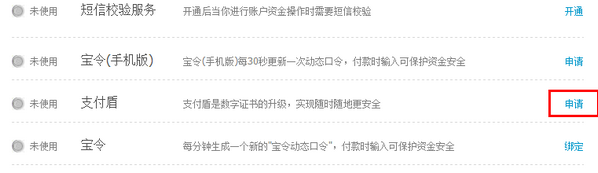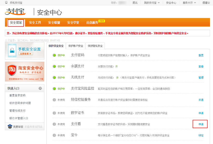 1 登录支付宝账户( www.alipay.com), 点击【安全中心】—【安全管家】—【支付盾】,点击【申请】