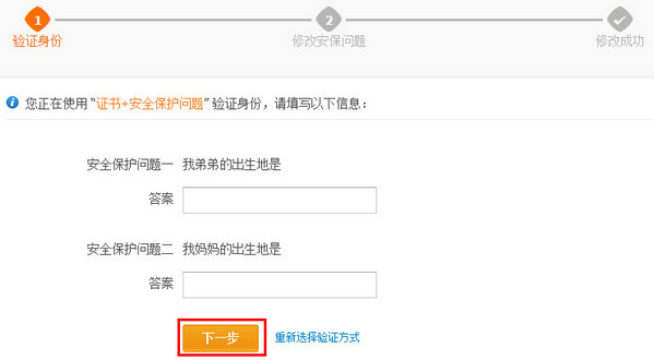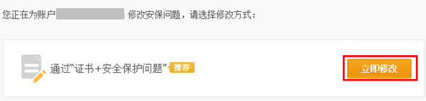 通过【证书+安全保护问题】修改安全保护问题的流程 大文 五月 26, 2016 安全中心 0 条评论 1570 围观 1 登录支付宝账户( www.alipay.com), 点击【账户设置】—【安全设置】,点击安全保护问题一栏后方的【修改】按钮 2 选择【通过证书+安全保护问题】,点击【立即修改】 3 输入原安全保护问题答案,点击【下一步】 4 设置新的安全保护问题和答案,点击【下一步】 5 确认新的安全保护问题和答案,点击【确定】 6 提示修改安保成功