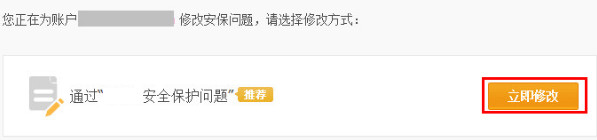 验证(原安报问题)方式修改安全保护问题的流程 大文 五月 26, 2016 安全中心 0 条评论 1619 围观 1 登录支付宝账户( www.alipay.com), 点击【账户设置】—【安全设置】,点击安全保护问题一栏后方的【修改】按钮 2 选择【通过安全保护问题】,点击【立即修改】 3 输入原安全保护问题答案,点击【下一步】 4 设置新的安全保护问题和答案,点击【下一步】 5 确认新的安全保护问题和答案,点击【确定】 6 提示修改安保成功
