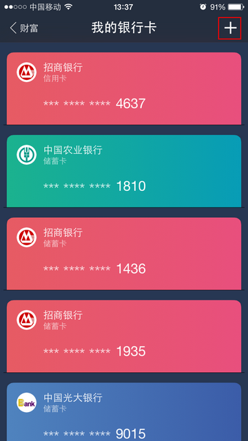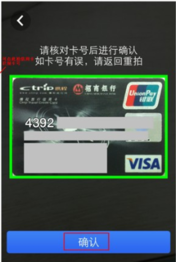 4 也可以点击右上方蓝色相机图标,通过手机拍银行卡正面的方式识别银行卡号 仅支持大陆发行的个人类型信用卡