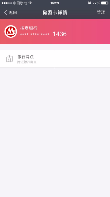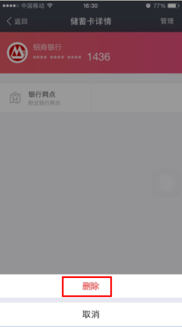 通过手机支付宝,撤销快捷的流程 大文 五月 27, 2016 无线支付宝 0 条评论 1569 围观 1 手机登录支付宝, 点击【我的】—【银行卡】 2 可以查看账户绑定的银行卡情况 3 选择其中一张银行卡,即可查看银行卡详情 4 点击右上角【管理】 5 点击【删除】 6 输入支付密码,点击【确定】 7 删除成功