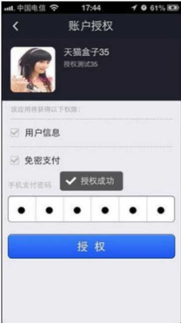 在手机支付宝上,如何进行账户授权 大文 五月 27, 2016 无线支付宝 0 条评论 1377 围观 1 发起智能设备的授权请求后,支付宝APP授权界面如下 当本手机未通过移动快捷认证时,点击【授权】 2 进入移动快捷界面完成移动快捷认证,即完成账户授权 3 当本手机已通过移动快捷认证,用户输入密码后,点击【授权】完成认证