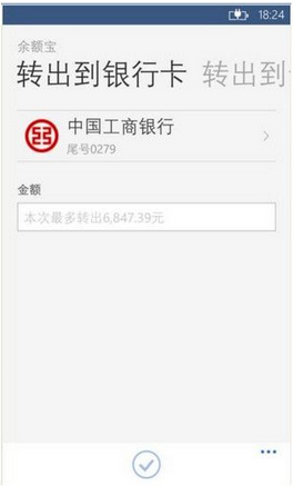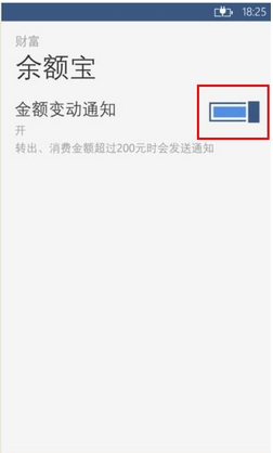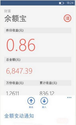 通过支付宝钱包WP8,如何操作余额宝转入、转出 大文 五月 27, 2016 无线支付宝 0 条评论 1092 围观 1 手机登录支付宝, 点击【财富】—【余额宝昨日收益】 2 点击【余额宝首页右下角】,可操作余额宝转入、转出及设置余额宝金额变动通知。 以转出为例,向右滑动可以切换转出到银行卡和转出到余额 3 金额变动通知页面,可以通过左右滑动开关是否开启变动通知
