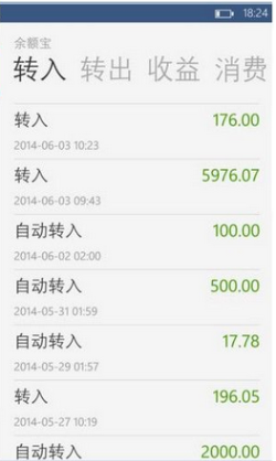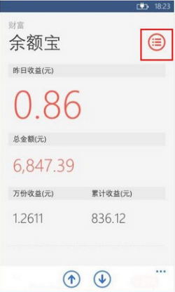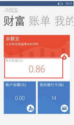 通过支付宝钱包WP8,如何查看余额宝 大文 五月 27, 2016 无线支付宝 0 条评论 1080 围观 1 手机登录支付宝, 点击【财富】—【余额宝昨日收益】 2 查看余额宝总金额及累计收益,点击【右上角的图标】,通过向右滑动可以查看转入、转出、收益和消费明细