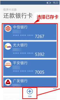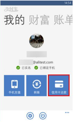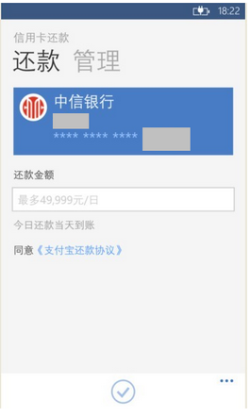 通过支付宝钱包WP8,如何操作信用卡还款? 大文 五月 27, 2016 无线支付宝 0 条评论 1301 围观 1 手机登录支付宝, 进入【信用卡还款】 2 选择已存的还款银行卡输入还款金额,或点击【+】输入还款信息 3 完成支付