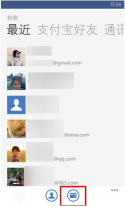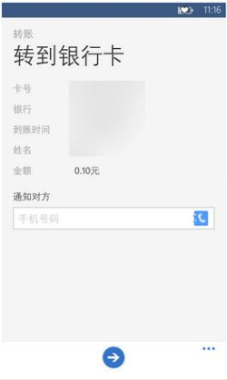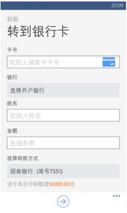 通过支付宝钱包WP8,如何操作转账到银行卡? 大文 五月 27, 2016 无线支付宝 0 条评论 1532 围观 1 手机登录支付宝, 点击【转账】 2 选择【转账到银行卡】银行卡图标,输入银行卡信息 3 完成支付