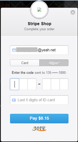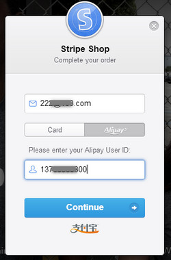 购物—国际极简支付(Stripe)操作流程 大文 五月 27, 2016 国际业务 0 条评论 1596 围观 1 在商户端选择商品填写收货地址等信息,如: https://shop.stripe.com/testmode_discount 2 在Stripe上选择支付宝付款,输入邮箱: 若输入的邮箱为支付宝账户,支付宝会下发短信到账户绑定的手机上,输入验证码; 3 若输入邮箱不是支付宝账户,会让用户重新输入支付宝账户(可以输入手机账户)。 4 填写收到的短信校验码和身份证后5位,并确认支付。 5 支付成功,收到支付宝短信。