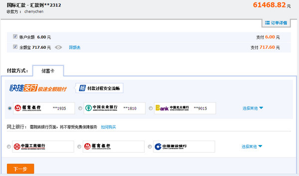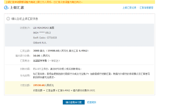 通过电脑端,如何操作上银汇款? 大文 五月 27, 2016 国际业务 0 条评论 3235 围观 1 登录支付宝账户(www.alipay.com), 点击【应用中心】—【转账】—【 上银汇款】。 2 填写汇款信息:收款账户、收款人地址、汇款人地址、币种、汇款用途等,点击【下一步】。 若之前已经汇过款,可以选择已存收款账户及收款人 3 点击【确认信息并付款】 4 选择支付方式进行付款