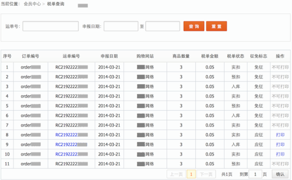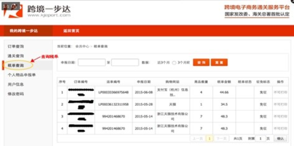 海外直购如何查询税单? 大文 五月 27, 2016 国际业务 0 条评论 3021 围观 为提高清关、配送时效,支付宝海外直购业务将用户交易信息直接向海关系统进行申报,海关进行批量征税,该种模式下海关系统仅按月提供批量申报的总税单,无法提供单笔交易的个人行邮税单详情。如您需要确认单笔交易征税情况,可以通过以下方式查询 1 关于税单需求,建议您可以登录 http://www.kjeport.com/电子口岸网站查询跨境贸易个人行邮税税单,请使用支付人的身份证号进行注册、登录,查询相应的个人行邮税单,具体查询步骤及路径如下,祝您生活愉快,谢谢! 第一步:注册为跨境一步达平台个人用户。 第二步:注册完成后输入密码登录系统,在“我的跨境一步达”页面,点击【税单查询】菜单(不要选订单查询),如下图:(订单查询中的订单信息以及个税信息来源于用户下单的商户而并非实际征税情况,如用户需要查询该订单是否实际被征税以及被征税金额,请点击【税单查询】进行查询) 2 进入税单查询列表页面,请根据“申报日期”进行查询,用户可以自行设定精确的时间段查询,或者点击右边的【近3个月】或者【3个月前】进行模糊搜索,如下图:( 注:用户若不知道订单具体被征税时间,请参考订单的物流详情中“包裹清关完成”这个时间节点,建议用户采用模糊搜索。) 3 第三步:点击操作列【打印】按钮,系统展示税单详情页面,点击【打印】按钮即可打印税单。 特别说明:只有税单状态为“实扣”或“入库”且征免标志为“应征”的税单方可以打印,否则系统显示不可打印
