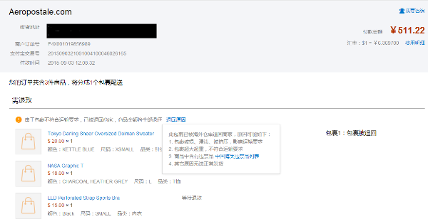 订单信息主要包含:用户的收货地址、物流配送方式描述、订单支付时间、交易来源商户、订单号、支付宝交易号、用户支付的费用信息、用户购买的商品信息、用户包裹对应的物流信息