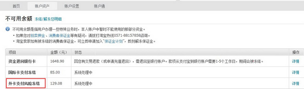 5 当交易状态为:【付款确认中】时,前台不可以用余额中,冻结类型会显示【外卡支付风险冻结】。