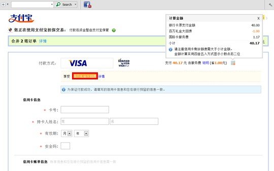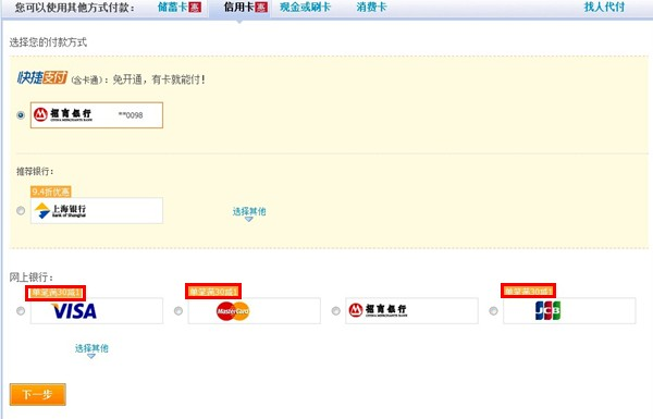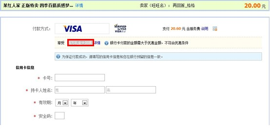 2 选择信用卡,进入下一步卡信息填写页面,此页面会显示当前的优惠享受情况。在满立减活动中,虽然能在收银台看到优惠提示,但进入卡信息填写页面后,若不符合活动条件,则优惠享受情况处会变为灰色不可用状态。