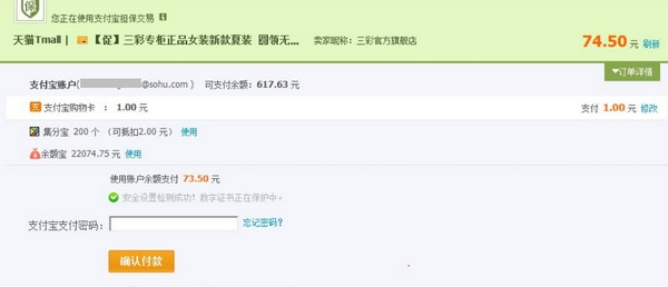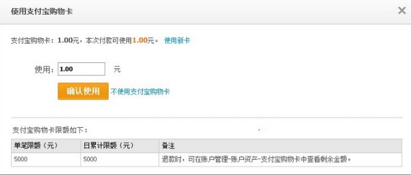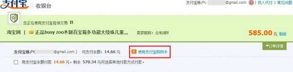 如何使用支付宝购物卡付款? 大文 五月 28, 2016 国际业务 0 条评论 1787 围观 1、 在天猫或淘宝选择好商品,提交订单后,在国际收银台选择相应版本(香港、台湾、海外其他地区版,可自行切换)—【使用支付宝购物卡】付款; 2、 未添加过卡的:输入卡号及密码,点击【确认使用】; 3、 成功添加支付宝购物卡后,输入支付金额,点击【确认使用】; 4、 输入支付密码完成付款。 已添加过卡的:付款页面能够看到支付宝购物卡余额,点击【使用】再输入支付密码完成付。