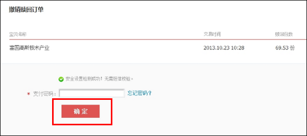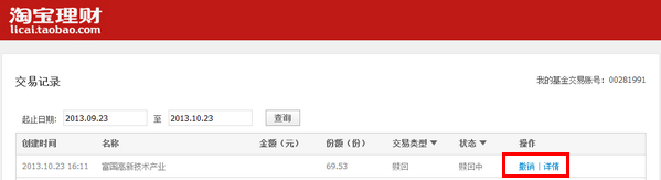 赎回淘宝基金的操作如何撤销? 大文 五月 29, 2016 应用中心 0 条评论 1284 围观 1 进入淘宝基金对应店铺首页, 点击页面左侧基金工具箱里的【交易记录查询】 2 进入交易记录页面,选择需撤销的该笔赎回基金,操作【撤销】 3 输入支付密码,点击【确定】 4 操作成功后,待基金公司确认即可