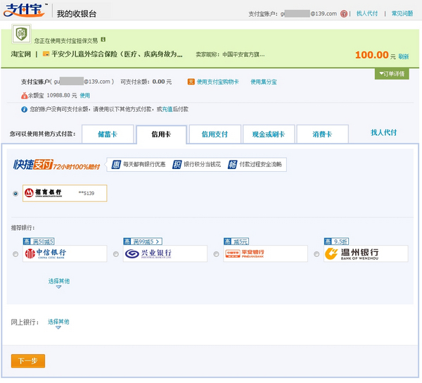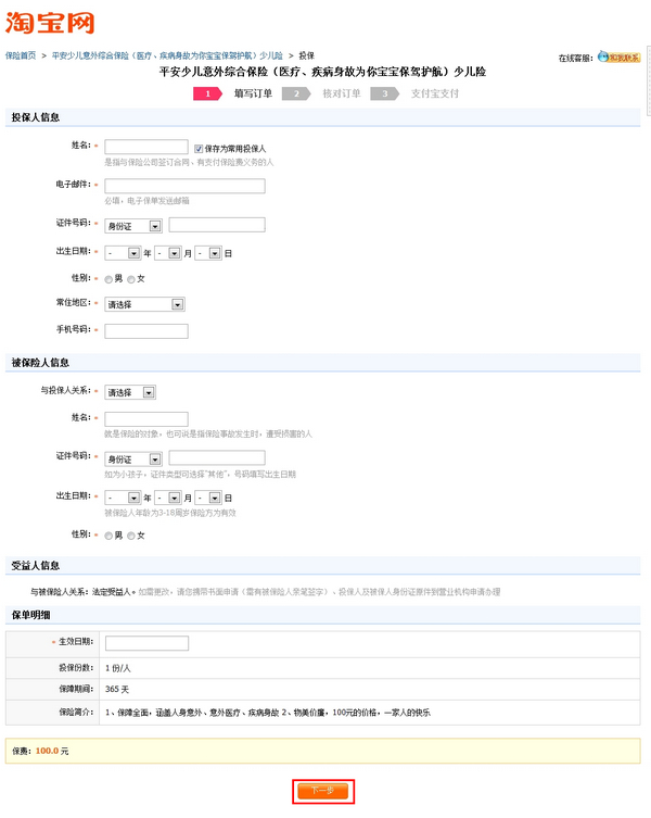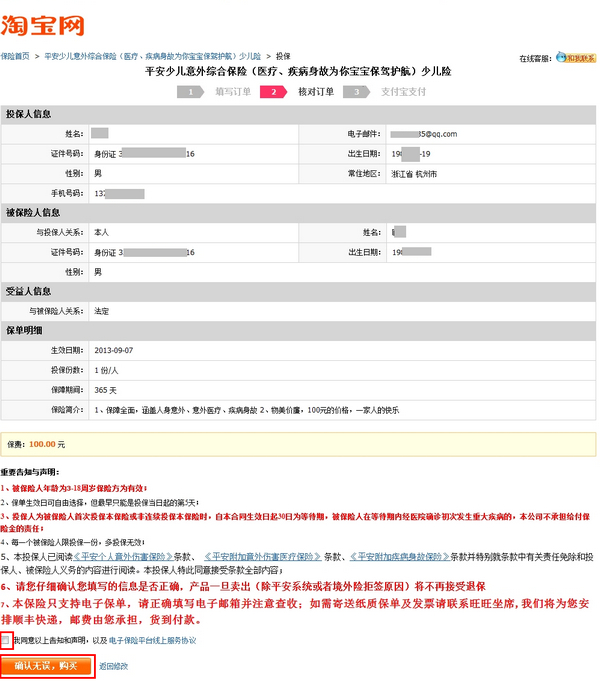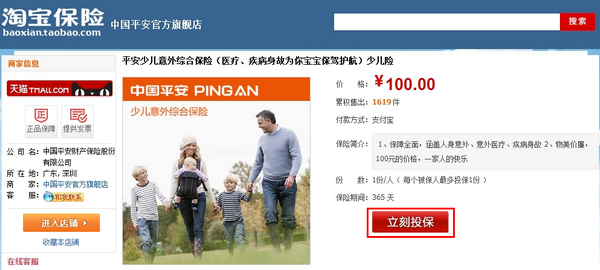 如何购买淘宝保险 大文 五月 29, 2016 应用中心 0 条评论 1317 围观 1 找到想要购买的淘宝保险产品,点击【立刻投保】, 频道首页:baoxian.taobao.com, 不同险种购买时需填写的信息、步骤略有不同, 如有疑问可咨询各保险店铺旺旺客服 2 按提示填写保险相关信息,点击【下一步】 3 确认信息,勾选同意相关协议,点击【确认无误,购买】 4 核保成功(系统自动操作),在支付宝收银台完成支付操作即可