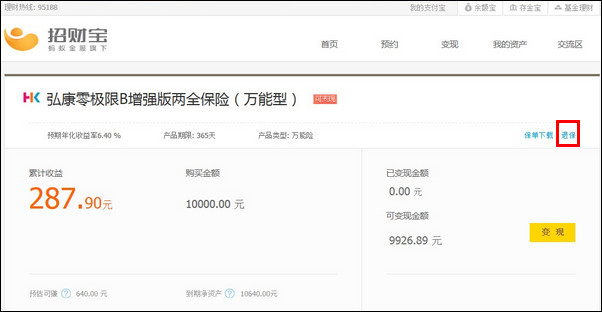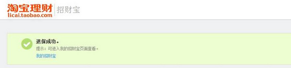 招财宝—保险产品退保流程 大文 五月 29, 2016 应用中心 0 条评论 1721 围观 1 登录招财宝(zhaocaibao.alipay.com)页面,点击【我的资产】 2 找到对应的保险产品,点击【详情】—【退保】 3 进入退保页面,输入支付密码,点击【确定】 4 提交退保申请成功 财富招之即来,马上来招财宝抢高收益理财 https://zhaocaibao.alipay.com