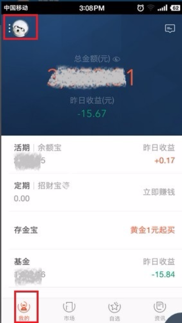 登录蚂蚁聚宝客户端, 点击左上角【头像】