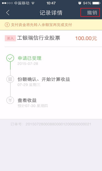 蚂蚁聚宝基金交易撤单的流程 大文 六月 3, 2016 应用中心 0 条评论 1324 围观 1 登录蚂蚁聚宝客户端, 点击【我的】—【基金】 2 选择需要撤单的基金 3 点击对应记录 4 点击右上角【撤销】,按照页面提示完成即可