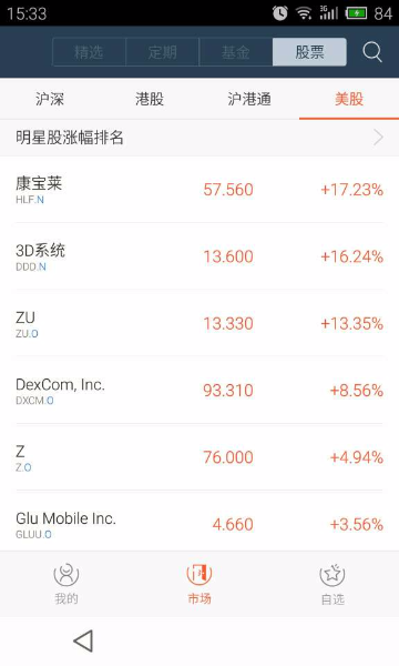 蚂蚁聚宝市场股票部分美股模块介绍 大文 六月 3, 2016 应用中心 0 条评论 1331 围观 1 可以查看美股市场行情数据,包括中概股涨幅排名、明星股涨幅排名 2 中概股排行列表包含大陆在美国上市公司股票名称和代码、最新价、涨跌幅三列数据,页面最多显示50条数据,列表按涨幅倒序排列 3 明星美股排行列表包含美国知名股票名称和代码、最新价、涨跌幅三列数据,页面最多显示50条数据,列表按涨幅倒序排列