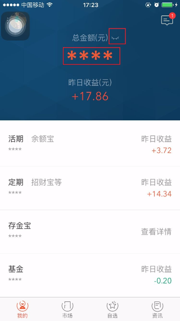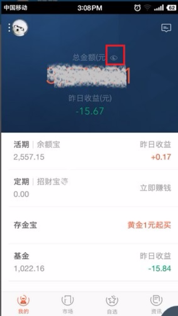 蚂蚁聚宝隐藏总资产流程 大文 六月 3, 2016 应用中心 0 条评论 1353 围观 1 登录蚂蚁聚宝客户端, 点击“小眼睛”标志,隐藏总资产和其他各项理财产品的总资产 2 再次点击“小眼睛”标志,显示总资产和其他各项理财产品的总资产