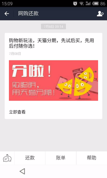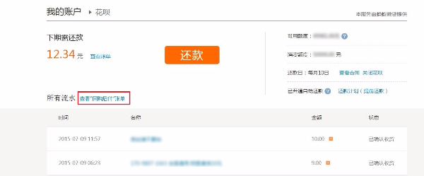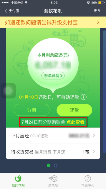 蚂蚁花呗天猫分期、去啊分期、大学生分期还款和查看账单流程 大文 六月 3, 2016 应用中心 0 条评论 1384 围观 2015年7月16日之后创建的订单请参考蚂蚁花呗操作流程: 手机登录支付宝,查询蚂蚁花呗账单的流程 手机登录支付宝,进行蚂蚁花呗还款的流程 查看蚂蚁花呗的消费明细和还款流水的流程 电脑端蚂蚁花呗还款流程 2015年7月16日之前创建的订单请参照下面步骤: 一、电脑端操作路径 1 登录支付宝账户(www.alipay.com), 选择蚂蚁花呗下的 【查看】 2 点击【查看“网购后付”账单】进入账单查询和还款页面(提前还款进入还款页面后点击【还款计划】) 二、通过手机支付宝“服务窗”操作路径 1 手机登录支付宝, 在“服务窗”添加【网购还款】为关注,点击【还款】 2 进入具体的还款页面后,可查看需要还款金额,继续点击页面下方【还款】,选择支付方式后操作还款即可 三、通过手机支付宝【蚂蚁花呗】入口操作路径 1 老天猫分期用户还款路径为:支付宝手机客户端—【蚂蚁花呗】—首页还款下方的【分期购账单】,点此查看进入还款。