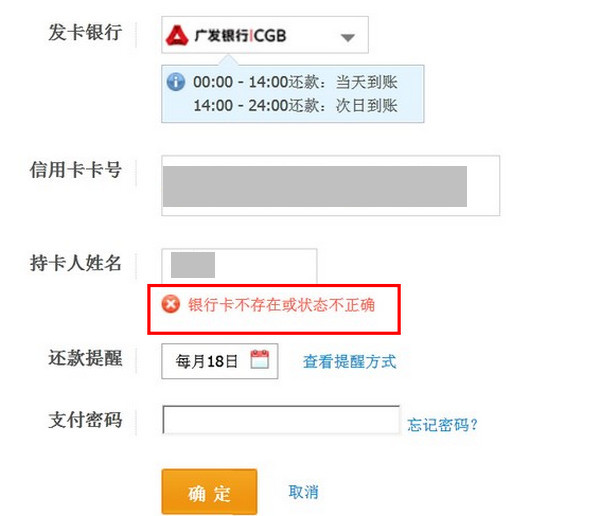为广发信用卡还款时提示“银行卡不存在或状态不正确”: