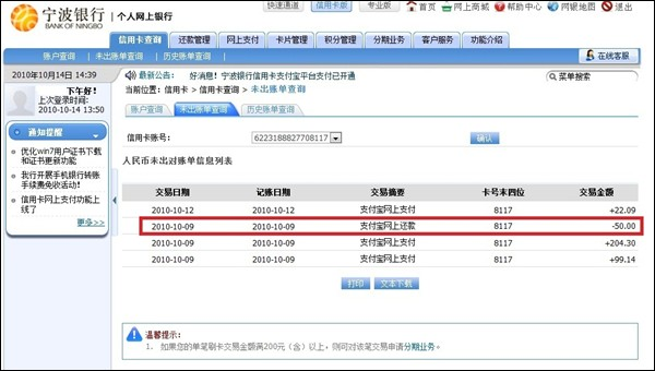 宁波银行信用卡还款到账查询 大文 六月 3, 2016 应用中心 0 条评论 1601 围观 1 登录支付宝账户(www.alipay.com), 点击【交易记录】,在交易分类中选择【还款】进行查询,找到对应交易后点击【详情】 2 登录宁波银行:www.nbcb.cn, 进入信用卡版网银查询相关交易明细,点击【信用卡查询】—【未出账单查询】。也可咨询 宁波银行服务热线:95574 3 选择需要查询的卡号,点击【确认】,即可在交易明细中查询到成功的支付宝还款交易
