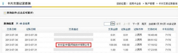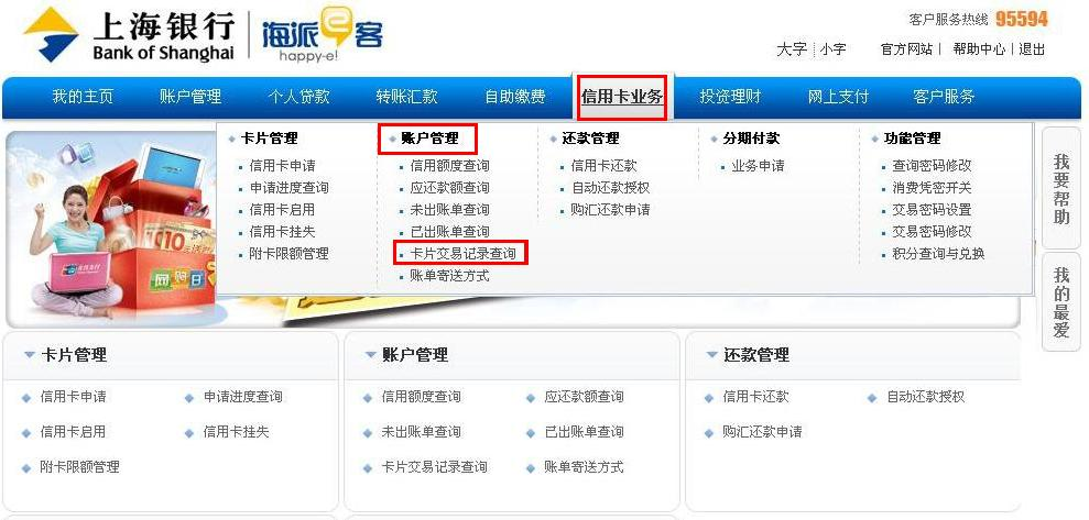 上海银行信用卡还款到账查询 大文 六月 3, 2016 应用中心 0 条评论 1118 围观 1 登录上海银行:http://www.bankofshanghai.com/, 点击【信用卡业务】—【账户管理】—【卡片交易记录查询】 2 选择要查询的信用卡卡号和查询的月份,点击【查询】 3 通过支付宝进行信用卡还款的,交易描述为“支付宝(中国)网络技术有限公司”