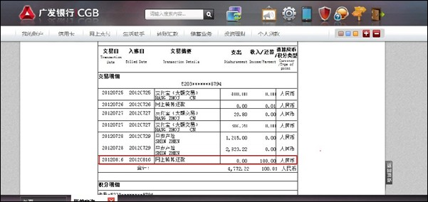 广发银行信用卡还款到账查询 大文 六月 3, 2016 应用中心 0 条评论 1218 围观 1 登录支付宝账户(www.alipay.com), 点击【交易记录】,在交易分类中选择【还款】进行查询,找到对应交易后点击【详情】 2 登录广发银行:www.cgbchina.com.cn,点击【信用卡】—【账户管理】—【账单查询或历史交易查询】显示为“网上转账还款”,在这列您可找到您信用卡还款的金额。也可拨打广发银行信用卡中心服务热线详细咨询