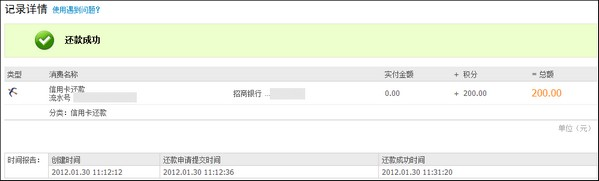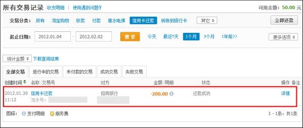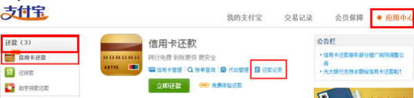 信用卡还款到账时间查询方法 大文 六月 3, 2016 应用中心 0 条评论 1399 围观 1 登录支付宝账户(www.alipay.com), 点击【应用中心】—【信用卡还款】—【还款记录】 2 根据还款时间找到需要查询的还款记录点击【详情】 3 可查看到入账时间