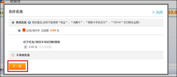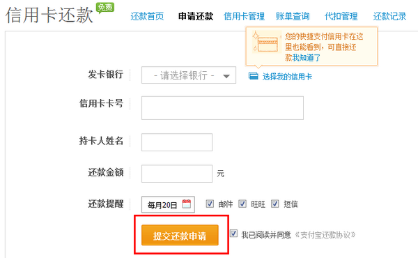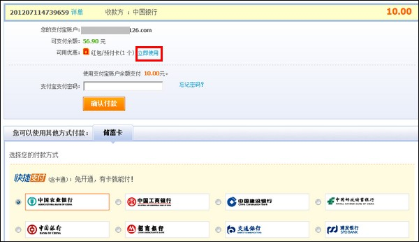 信用卡还款、水电煤缴费红包使用流程 大文 六月 3, 2016 应用中心 0 条评论 1598 围观 1 登录支付宝账户(www.alipay.com), 点击【应用中心】—【信用卡还款】—【立即还款】 2 输入卡号、姓名等信息,点击【提交还款申请】 3 在可用优惠那里,点击【立即使用】 4 勾选红包后,点击【下一步】,输入支付宝支付密码完成付款