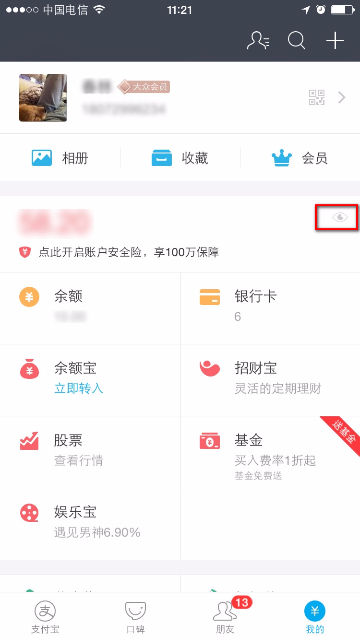 手机登录支付宝, 点击【我的】—账户资产旁的眼睛图标