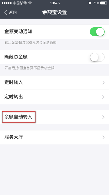 通过手机支付宝开通自动转入的流程 大文 六月 4, 2016 无线支付宝 0 条评论 1836 围观 1 手机登录支付宝, 点击【我的】,选择【余额宝】 2 点击右上角图标 3 选择【余额自动转入】,打开\关闭开关;打开可以设置保留余额(默认0元)