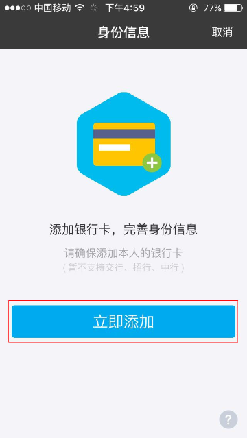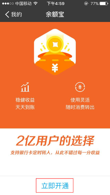 通过手机支付宝,操作余额宝开户的流程 大文 六月 4, 2016 无线支付宝 0 条评论 2238 围观 1 手机登录支付宝, 点击【我的】,选择【余额宝】 2 点击【立即开通】 3 添加银行卡,完成身份信息验证,点击【立即添加】 4 完成身份验证后,即可购买余额宝 先填入需转入金额,点击【确认转入】进入收银台页面,支付并完成付款即可 5 6