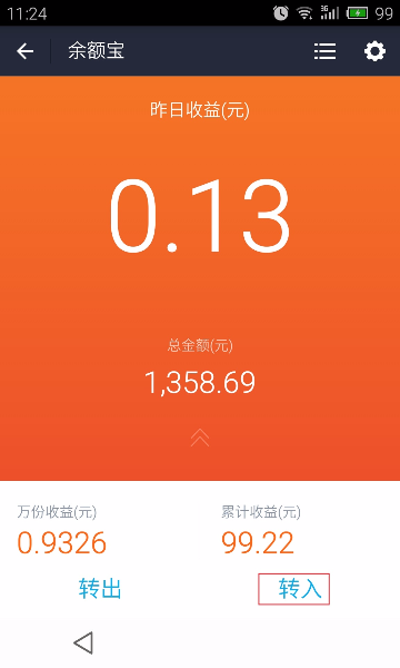 通过手机支付宝转入余额宝的流程 大文 六月 4, 2016 无线支付宝 0 条评论 1795 围观 1 手机登录支付宝, 点击【我的】,选择【余额宝】 2 点击【转入】 3 选择转入方式和转入金额,确认即可