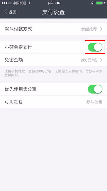 手机登录支付宝,如何开启/关闭小额免密支付 大文 六月 4, 2016 无线支付宝 0 条评论 1770 围观 1 手机登录支付宝, 点击右下角【我的】 2 点击【账户信息】 3 选择【设置】 4 点击【支付设置】 5 点击【小额免密支付】后的开关,可以开启或者关闭小额免密支付