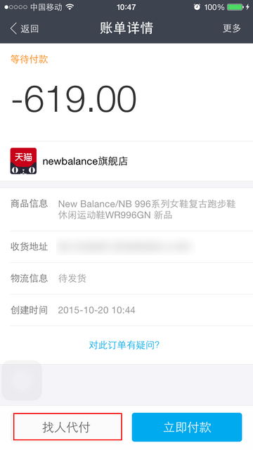 通过手机支付宝,申请代付的流程 大文 六月 4, 2016 无线支付宝 0 条评论 1766 围观 1 手机登录支付宝, 点击【账单】 2 选择需要申请代付的交易 3 点击【找人代付】 4 选择代付人 5 确认代付人信息后点击【找TA付款】,完成申请代付