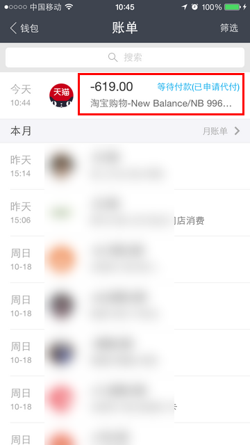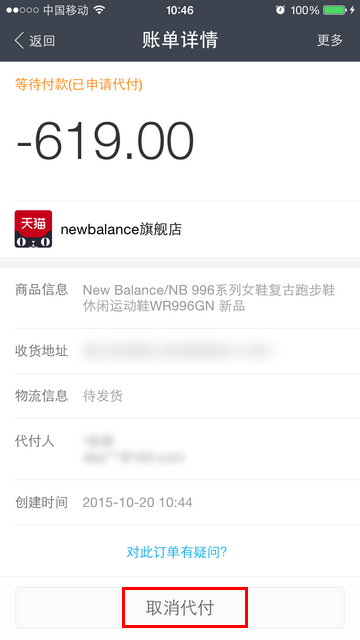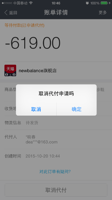 通过手机支付宝,取消代付的流程 大文 六月 4, 2016 无线支付宝 0 条评论 4602 围观 1 手机登录支付宝, 点击【账单】 2 选择已经申请代付的交易 3 点击【取消代付】 4 点击【确定】,取消成功