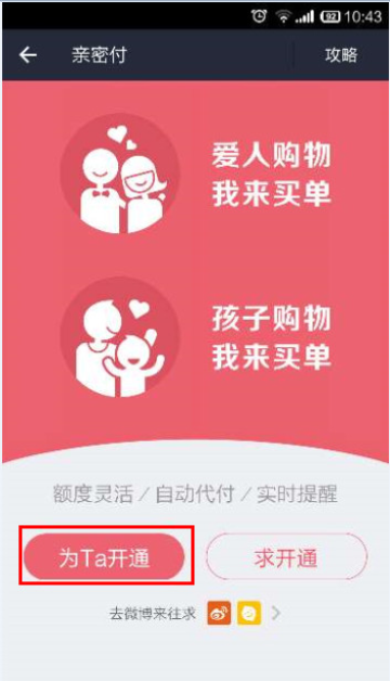 亲密付付款人开通流程 大文 六月 4, 2016 无线支付宝 0 条评论 1657 围观 1 手机登录支付宝, 点击【亲密付】 2 点击【为TA开通】 3 输入付款人的支付宝账户,点击【下一步】 4 设置每月额度,点击【开通】 5 输入支付密码,点击【确定】 6 亲密付开通成功