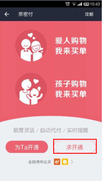 亲密付对象申请开通流程 大文 六月 4, 2016 无线支付宝 0 条评论 1551 围观 1 手机登录支付宝, 点击【亲密付】 2 点击【求开通】 3 输入付款人的支付宝账户,点击【下一步】 4 点击【确定】,等待付款人开通即可