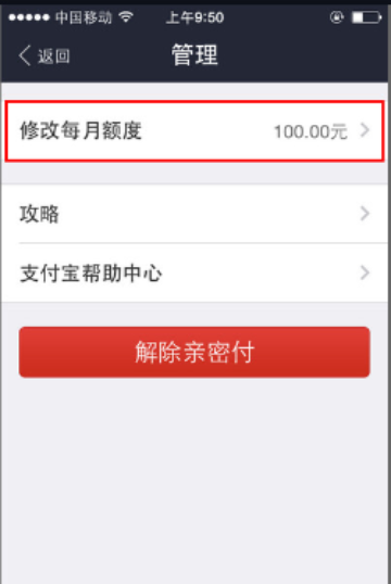 亲密付付款人修改亲密付额度流程 大文 六月 4, 2016 无线支付宝 0 条评论 1600 围观 1 手机登录支付宝, 点击【亲密付】 2 选择要修改额度的对象 3 点击右上角【管理】 4 点击【修改每月额度】 5 重新输入金额—点击【保存】 6 输入支付密码,点击【确定】完成修改