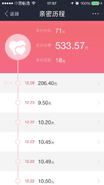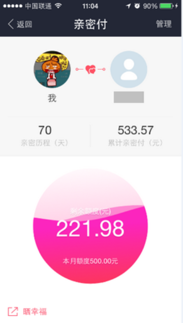 亲密付付款人查看为谁开通了亲密付的流程 大文 六月 4, 2016 无线支付宝 0 条评论 2512 围观 1 手机登录支付宝, 点击【亲密付】 2 直接显示亲密付对象的真实姓名,可点击【+】可添加其他亲密付对象 3 点击亲密付对象头像,显示如下 4 点击【剩余金额】,进入【亲密历程】,会按时间倒序显示消费时间、金额 注: 开通天数、消费金额、消费笔数:开通取消后重新开通,均会进行累计计算