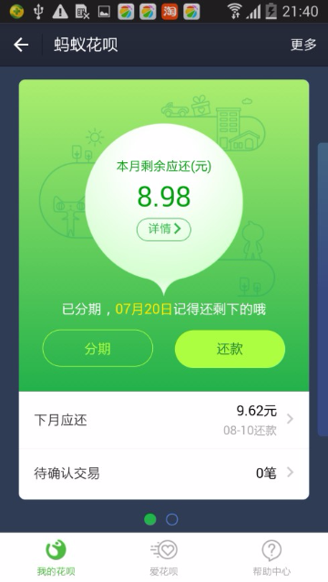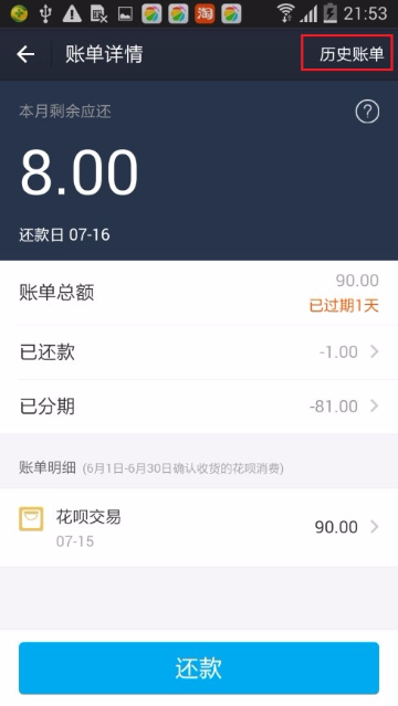 通过手机支付宝查询蚂蚁花呗账单的流程 大文 六月 4, 2016 无线支付宝 0 条评论 1801 围观 1 登录手机支付宝,点击【我的】—【蚂蚁花呗】 2 点击【详情】 3 点击【历史账单】,可查看上个月账单及更早的账单