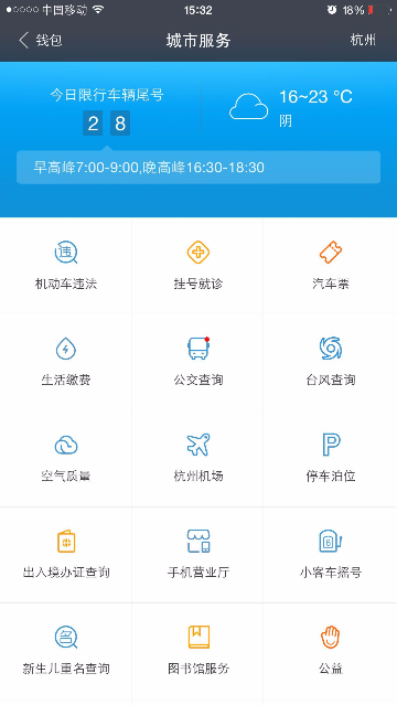通过支付宝APP,查看本地信息 大文 六月 4, 2016 无线支付宝 0 条评论 1232 围观 1 登录支付宝APP—【城市服务】,定位用户所在常住城市,即可看到当地车辆限行情况、早晚高峰时间、当地天气。