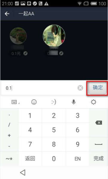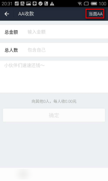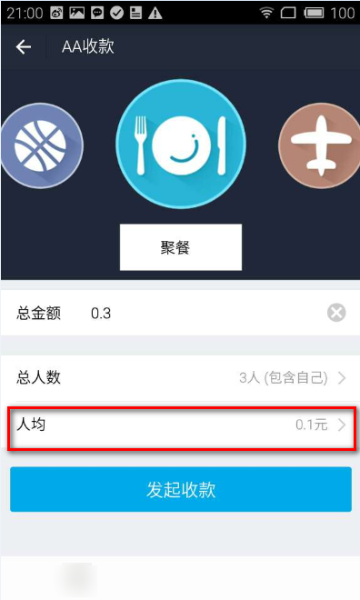 9 填写完金额提交后,自动计算人均金额并更新显示在每个收款对象上(收款人可以修改单个对象的收款金额,修改金额保留小数点后两位,必须大于等待0.01),确认对象和金额后提交,创建AA收款成功,系统通知被收款方;