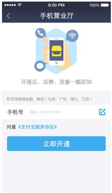 手机登录支付宝开通手机营业厅的流程 大文 六月 4, 2016 无线支付宝 0 条评论 1739 围观 1 手机登录支付宝,点击【手机充值】 2 点击左下角的【手机营业厅】 3 输入手机号码,点击【立即开通】 4 按照页面提示输入手机收到的短信检验码 5 开通后即可看到如下页面信息
