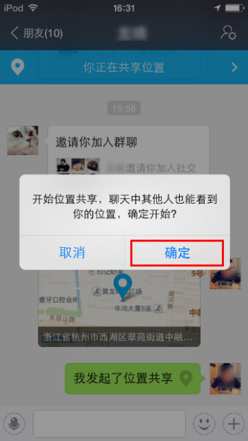 11 出现共享位置的提示,点击【确定】,也会进入位置共享页面