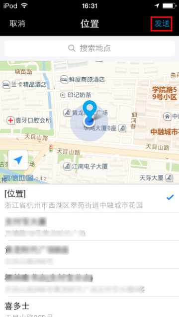 3 在位置页面选择地址后,点击【发送】